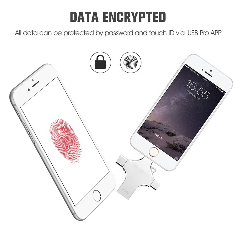 Memoria USB 128 Gb Flash Drive 4 en 1, el pendrive del futuro. Manteniéndose a la vanguardia de la industria, presenta la unidad flash Super Speed USB 3.0 de próxima generación para una rápida transferencia de datos y copias de seguridad con compatibilidad retroactiva con USB 2.0